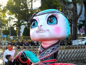 Linh vật rắn được trang trí mặc đồ thổ cẩm bắt mắt, mang văn hoá…