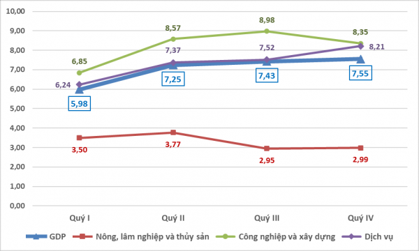 Tổng cục trưởng Tổng cục Thống kê công bố, tổng sản phẩm trong nước (GDP) quý IV/2024 ước tính tăng 7,55% so với cùng kỳ năm trước, chỉ thấp hơn quý IV các năm 2017, 2018 trong giai đoạn 2011-2024, duy trì xu hướng quý sau cao hơn quý trước (quý I tăng 5,98%, quý II tăng 7,25%, quý III tăng 7,43%).