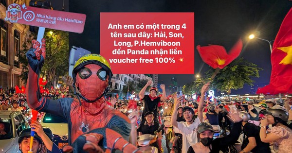 Với các tín đồ buffet, chuỗi nhà hàng Kichi Kichi tại miền Nam “chơi lớn” khi tặng buffet miễn phí cho bất kỳ ai tên Hải hoặc Long – những cái tên gắn liền với những người hùng đã làm nên chiến thắng lịch sử. Chưa hết, nhà hàng Juju Nướng còn mở rộng thêm “combo niềm vui” khi dành tặng voucher miễn phí 100% cho những người có tên Hải, Son, Long, hay thậm chí P.Hemviboon – tên cầu thủ Thái Lan ghi bàn phản lưới nhà đầy cảm xúc trong trận đấu.