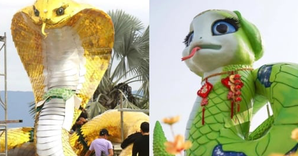“Cuộc đua” linh vật rắn – biểu tượng của năm Ất Tỵ – đón Tết Nguyên đán đang diễn ra rất sôi nổi và thu hút sự quan tâm của đông đảo cộng đồng mạng. Trong ảnh là một trong những linh vật rắn nổi bật đang “làm mưa làm gió” những ngày qua, được lắp đặt ở thành phố biển Đà Nẵng. Chú rắn hổ mang màu vàng với thần thái sinh động, đôi mắt sắc bén và dáng cuộn mình đầy khí thế này là tác phẩm của nghệ nhân Đinh Văn Tâm, người tạo ra linh vật mèo, hổ, rồng gây sốt những Tết trước. (Ảnh: Xuân Tiến)