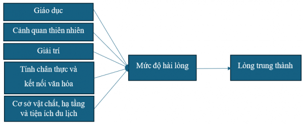 Dựa trên cơ sở lý thuyết, tác giả đề xuất mô hình các yếu tố ảnh hưởng đến hoạt động trải nghiệm DLNT tại huyện Ngọc Hiển, tỉnh Cà Mau gồm 5 yếu tố: giáo dục; cảnh quan thiên nhiên; giải trí; tính chân thực và kết nối văn hóa; cơ sở vật chất, hạ tầng và tiện ích du lịch. Nghiên cứu đồng thời xem xét ảnh hưởng của mức độ hài lòng lên lòng trung thành của du khách. Mô hình nghiên cứu được thể hiện tại Hình.