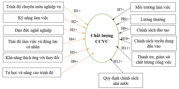 Chất lượng đội ngũ CCVC ngày càng được chú trọng cải thiện và nâng cao, là yếu trọng tâm giúp cải thiện hiệu suất và hiệu quả công việc, đặc biệt trong giai đoạn chuyển đổi số và phát triển bền vững của nền kinh tế ngày nay. Dựa trên tổng quan nghiên cứu về chất lượng CCVC, nhóm tác giả thiết lập mô hình gồm 12 nhân tố ảnh hưởng tới chất lượng CCVC, đó là: Trình độ chuyên môn nghiệp vụ; Kỹ năng làm việc; Đạo đức nghề nghiệp; Thái độ làm việc và động lực cá nhân; Khả năng thích ứng với thay đổi; Tự học và nâng cao trình độ; Môi trường làm việc; Lương thưởng; Chính sách đào tạo; Chính sách tuyển dụng đầu vào; Thanh tra, giám sát chất lượng công việc; Quy định chính sách nhà nước.