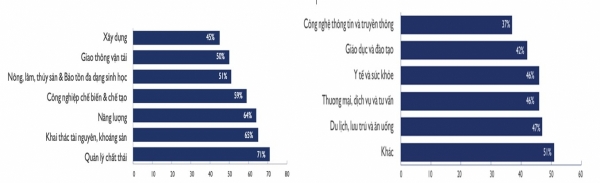Ở trụ cột môi trường. Doanh nghiệp tham gia khảo sát được đánh giá qua năm câu hỏi thuộc năm chủ đề: chính sách, công bố thông tin, kiểm toán báo cáo, nhân sự và tập huấn. Các doanh nghiệp đạt điểm trung bình 52%, trong đó các doanh nghiệp lớn thực hành tốt nhất về mặt môi trường với điểm trung bình 66% và số điểm giảm dần theo quy mô từ doanh nghiệp vừa, nhỏ đến siêu nhỏ, đạt lần lượt 61%, 48% và 39%, mức độ quan tâm đến môi trường tỷ lệ thuận với quy mô doanh nghiệp. Với nhóm sản xuất, lĩnh vực Quản lý chất thải là lĩnh vực tiêu biểu với các doanh nghiệp thuộc lĩnh vực này đạt điểm trung bình là 71%. So với các lĩnh vực trong nhóm, Xây dựng vẫn còn nhiều hạn chế khi các doanh nghiệp xây dựng chỉ đạt 45% tổng số điểm. Với nhóm lĩnh vực phi sản xuất, doanh nghiệp thuộc nhóm ngành Công nghệ thông tin và truyền thông đang ở mức thấp nhất là 37% (Hình 1).